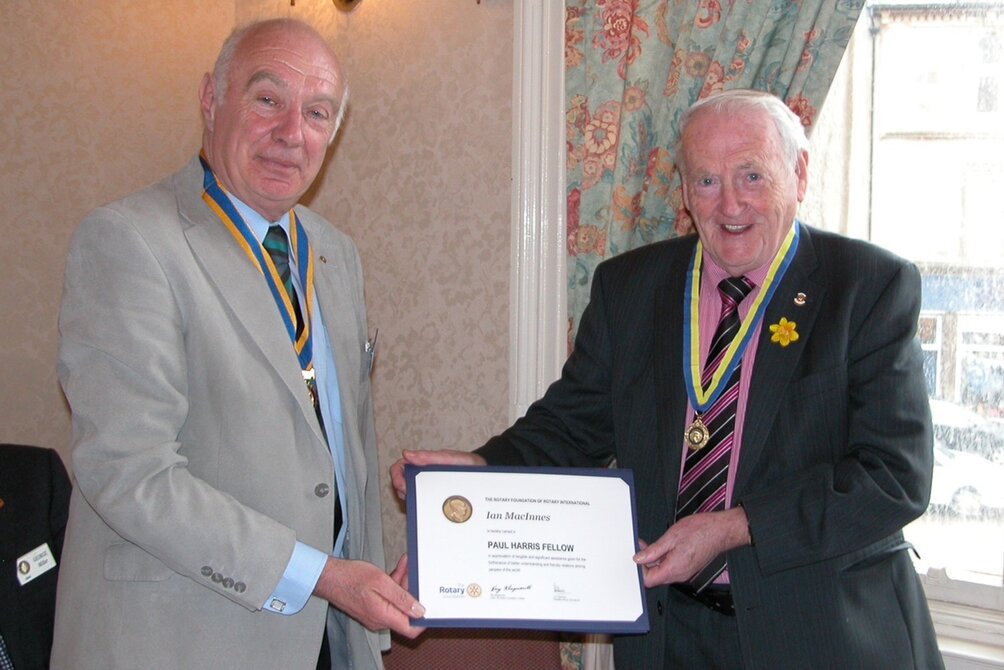 Oban Rotary President Ken Moncrieff recently presented Ian MacInnes with his Paul Harris certificate and medal in recognition of his outstanding commitment to Rotary and the Oban community. (PaulHarris, who was an American from Chicago, founded the Rotary Movement in 1905.)