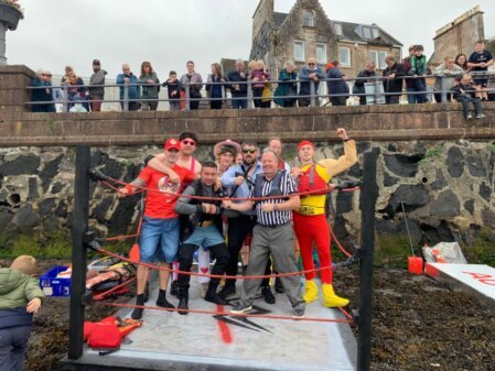 The winners of the overall race were AutoGlass winning a £100 Golf Lounge Voucher in addition to the trophy. The Best Raft went to No Bikini Bottoms from Dunstaffnage Marina who took away a bottle of 0.0 Rum. Best Sinking, a true honour and inspiration, went to Ora Rosa who earned their £100 Golf Lounge Voucher. Best Fancy Dress was awarded to Natural Disasters from Oban Distribution Services who really wrestled with the competition all day. They walked away with some Haribo and Tunnocks and £40 to boot. The Individual honour for best Fancy Dress is no surprise as a member of the Oban Distribution team, lovingly known as Pink Lycra. He was honoured with Haribo and £40. The team thought to be the most Glamorous was Ora Rosa.